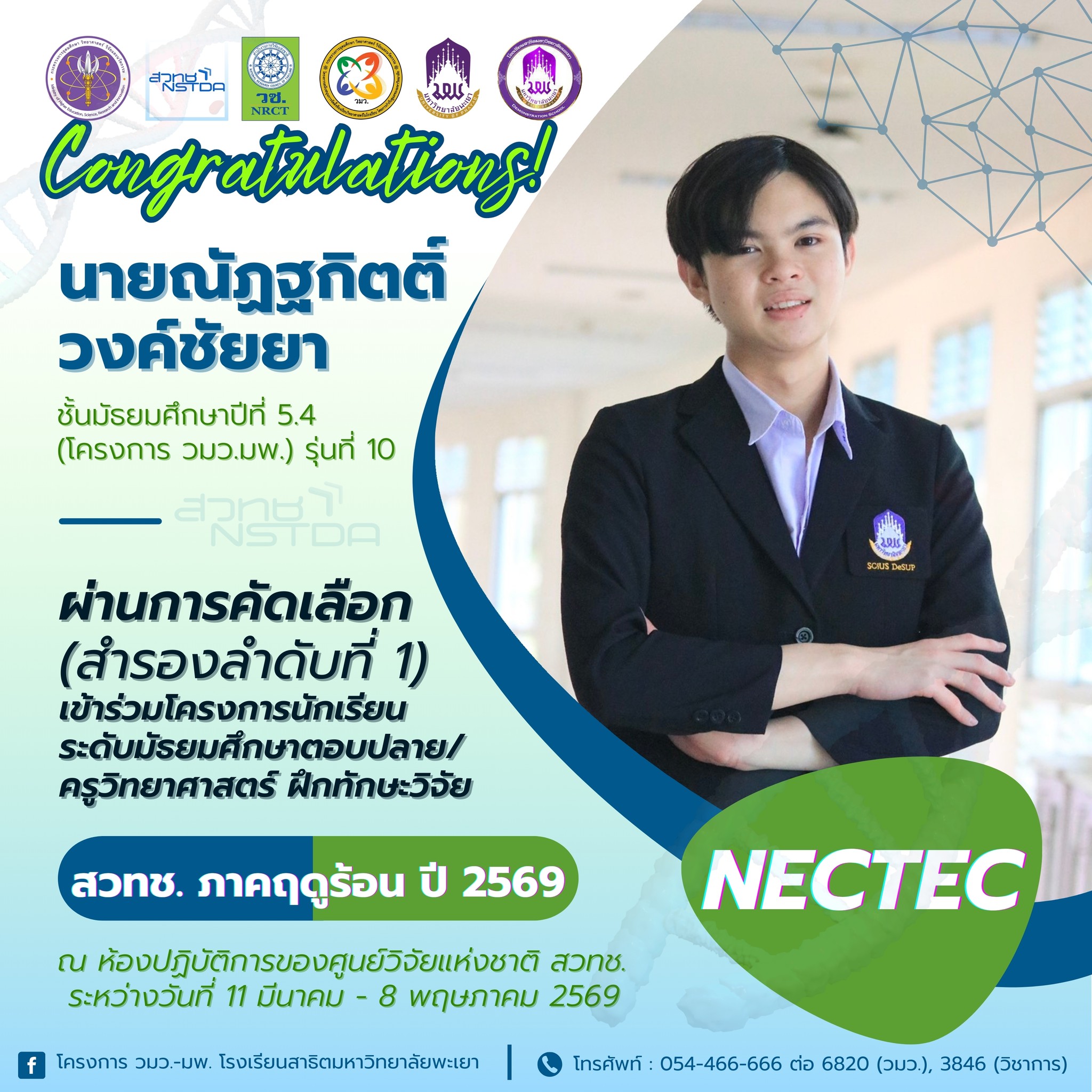 ที่ผ่านการคัดเลือกเข้าร่วมโครงการนักเรียนระดับมัธยมศึกษาตอบปลาย/ครูวิทยาศาสตร์ ฝึกทักษะวิจัย ณ ห้องปฏิบัติการของศูนย์วิจัยแห่งชาติ สวทช. ภาคฤดูร้อน ปี 2569 ระหว่างวันที่ 11 มีนาคม - 8 พฤษภาคม 2569
