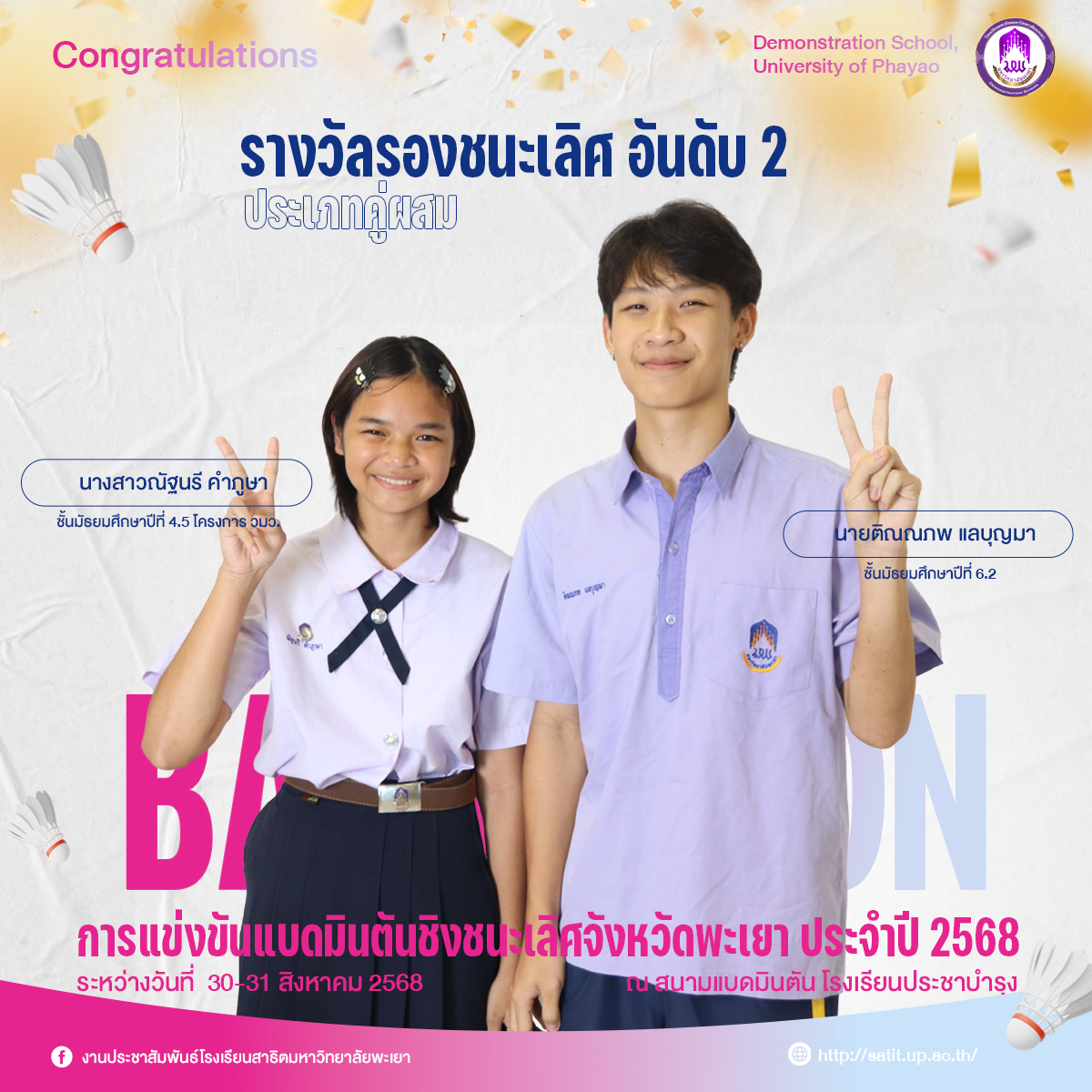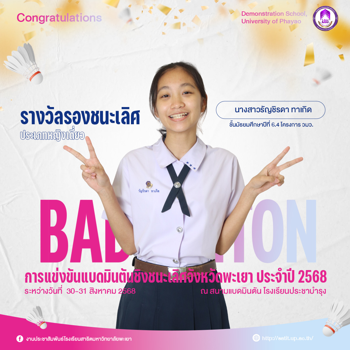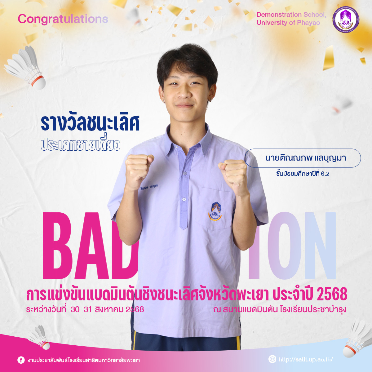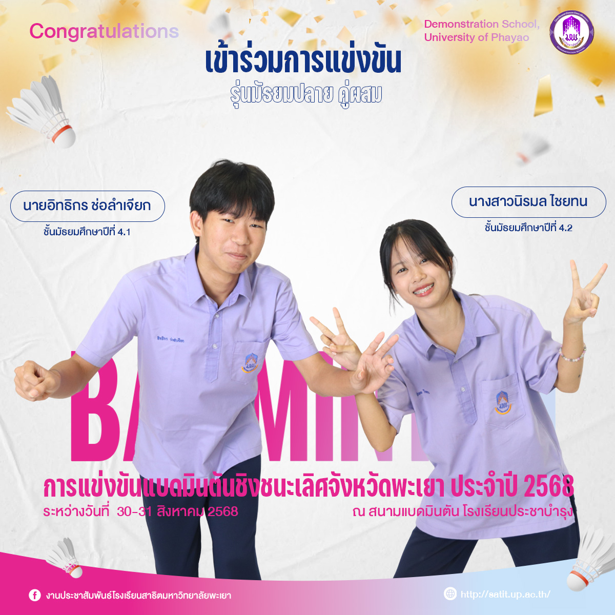 10 ตุลาคม 2568 การแข่งขันแบดมินตันชิงชนะเลิศจังหวัดพะเยา ประจำปี 2568 อ่าน 74 โรงเรียนสาธิตมหาวิทยาลัยพะเยา ขอแสดงความยินดีกับนักกีฬาที่ได้รับรางวัล และเข้าร่วมการแข่งขันแบดมินตัน การแข่งขันแบดมินตันชิงชนะเลิศจังหวัดพะเยา ประจำปี 2568 ระหว่างวันที่ 30-31 สิงหาคม 2568 ณ สนามแบดมินตัน โรงเรียนประชาบำรุง