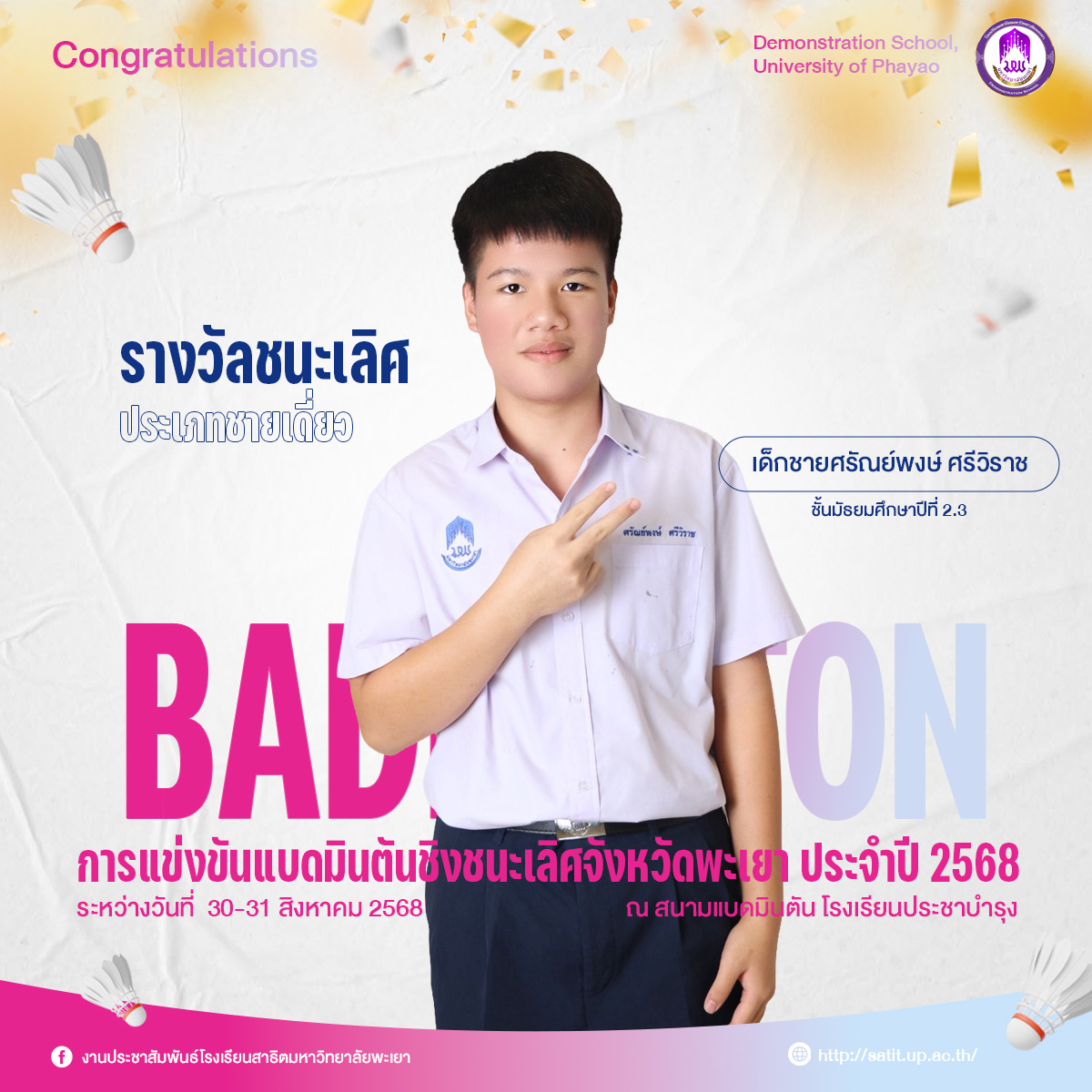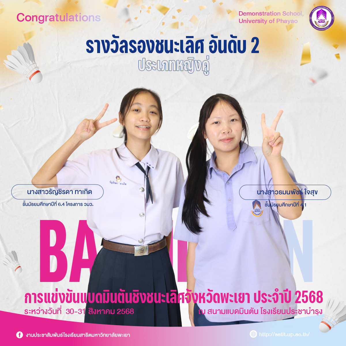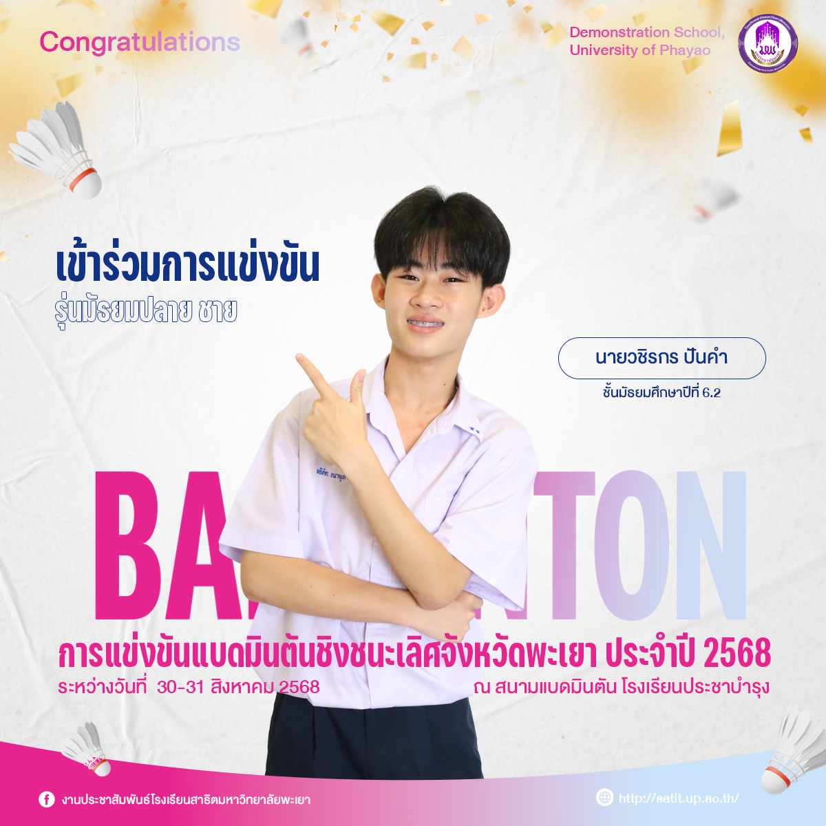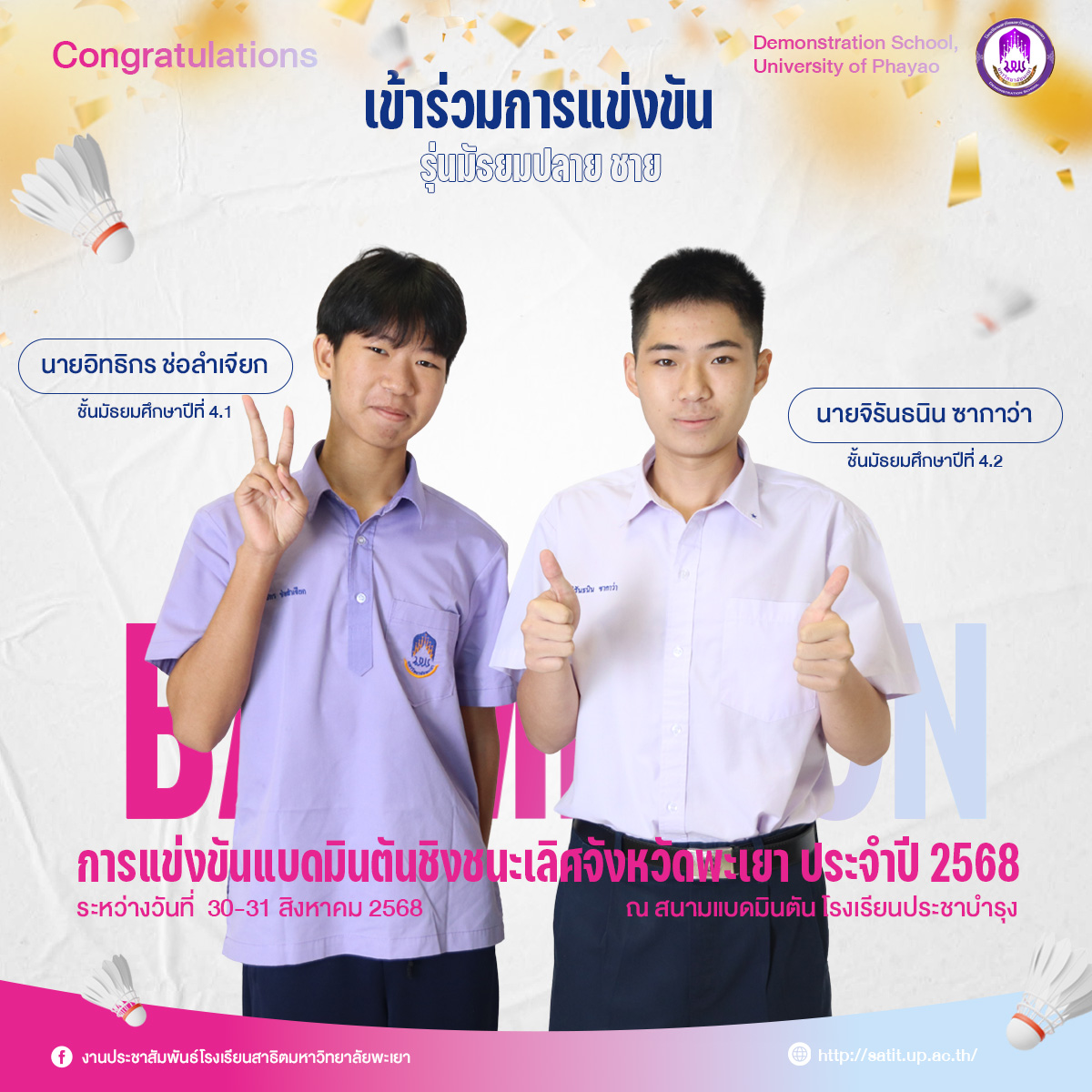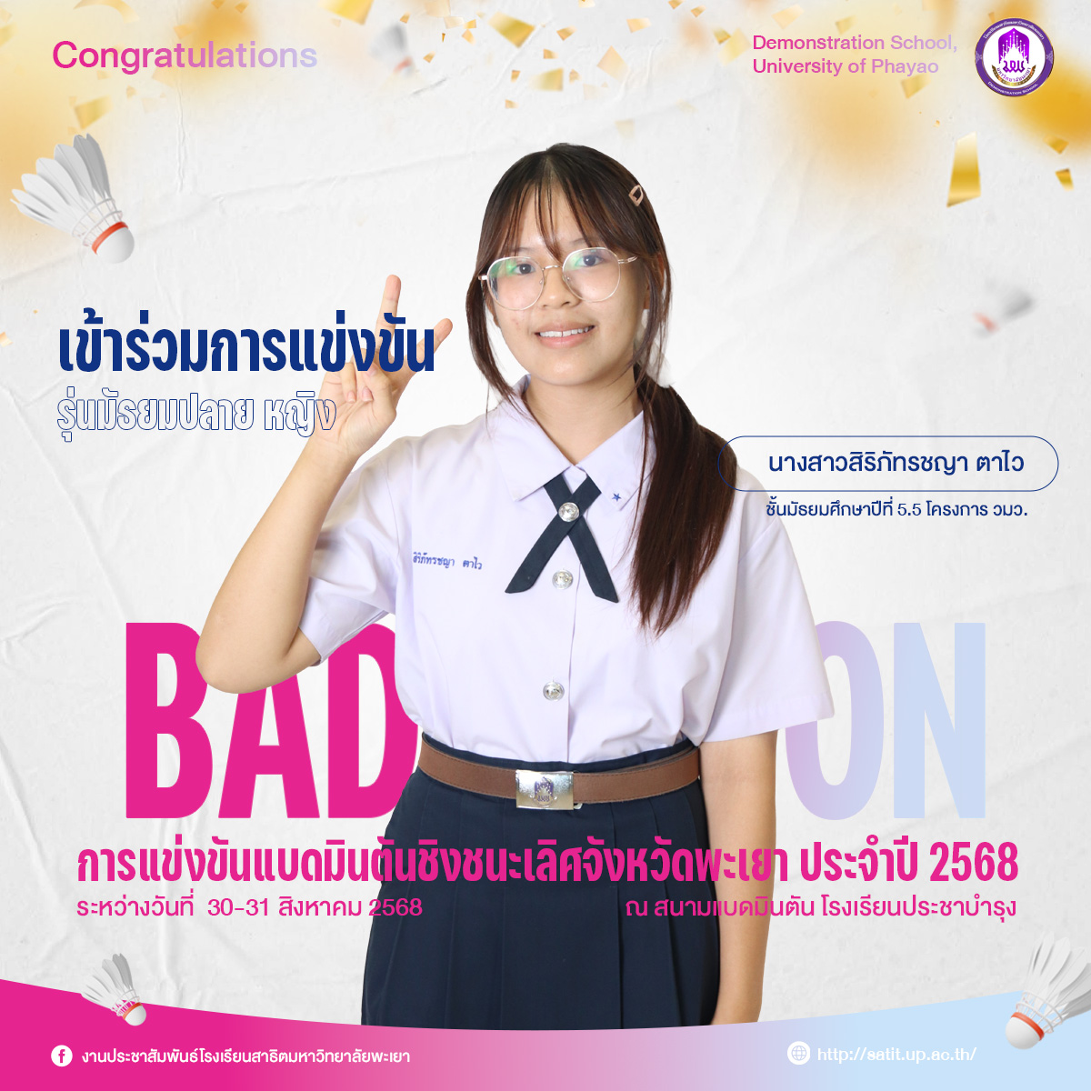 10 ตุลาคม 2568 การแข่งขันแบดมินตันชิงชนะเลิศจังหวัดพะเยา ประจำปี 2568 อ่าน 74 โรงเรียนสาธิตมหาวิทยาลัยพะเยา ขอแสดงความยินดีกับนักกีฬาที่ได้รับรางวัล และเข้าร่วมการแข่งขันแบดมินตัน การแข่งขันแบดมินตันชิงชนะเลิศจังหวัดพะเยา ประจำปี 2568 ระหว่างวันที่ 30-31 สิงหาคม 2568 ณ สนามแบดมินตัน โรงเรียนประชาบำรุง