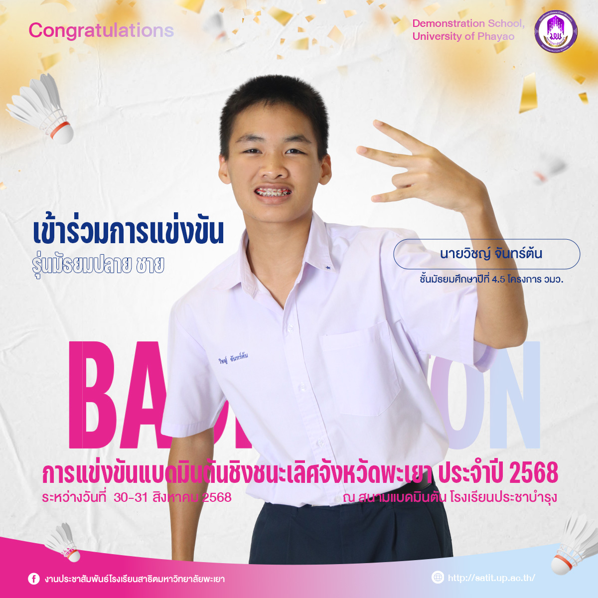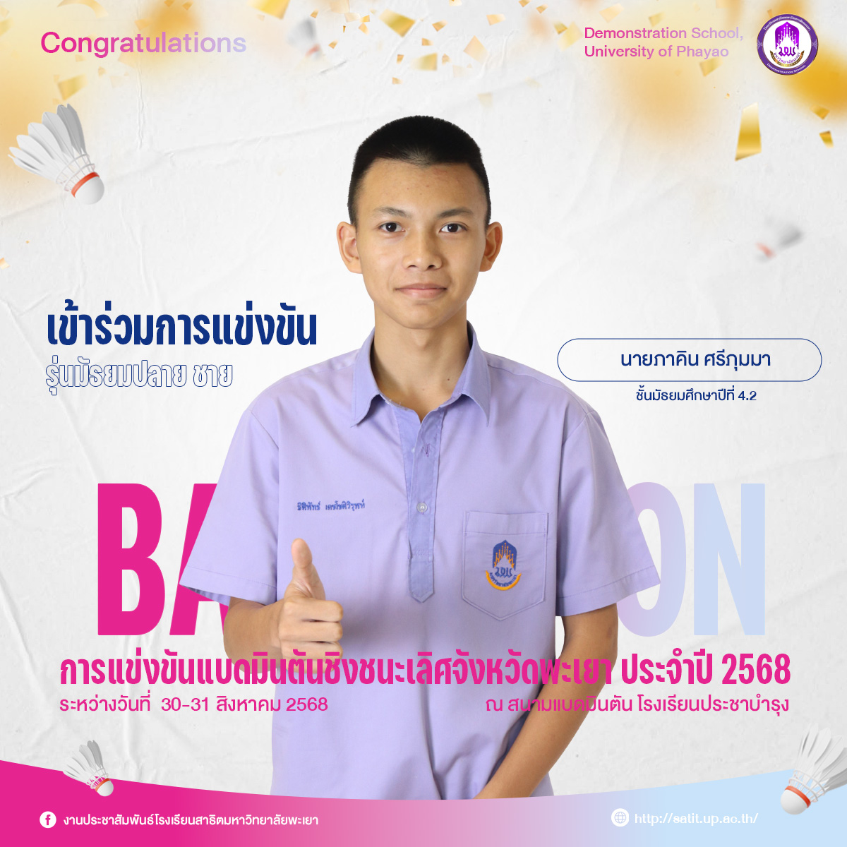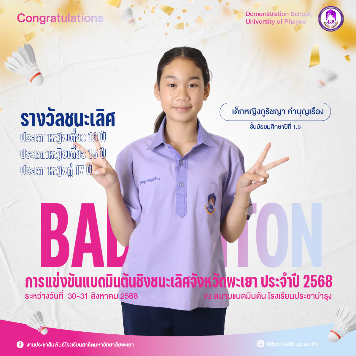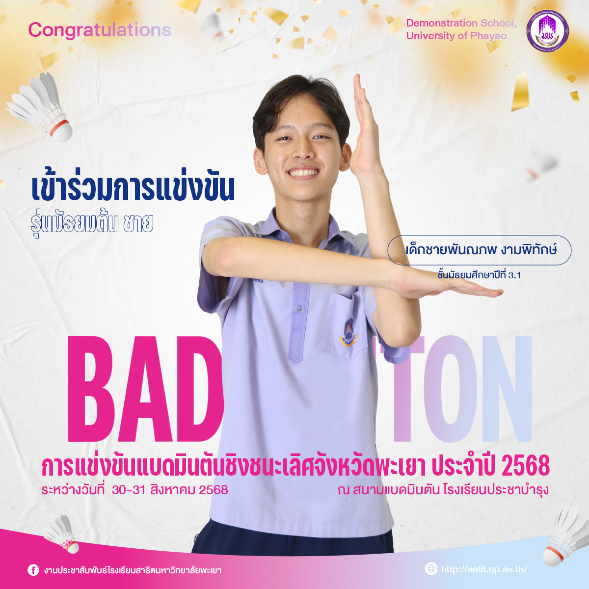 10 ตุลาคม 2568 การแข่งขันแบดมินตันชิงชนะเลิศจังหวัดพะเยา ประจำปี 2568 อ่าน 74 โรงเรียนสาธิตมหาวิทยาลัยพะเยา ขอแสดงความยินดีกับนักกีฬาที่ได้รับรางวัล และเข้าร่วมการแข่งขันแบดมินตัน การแข่งขันแบดมินตันชิงชนะเลิศจังหวัดพะเยา ประจำปี 2568 ระหว่างวันที่ 30-31 สิงหาคม 2568 ณ สนามแบดมินตัน โรงเรียนประชาบำรุง