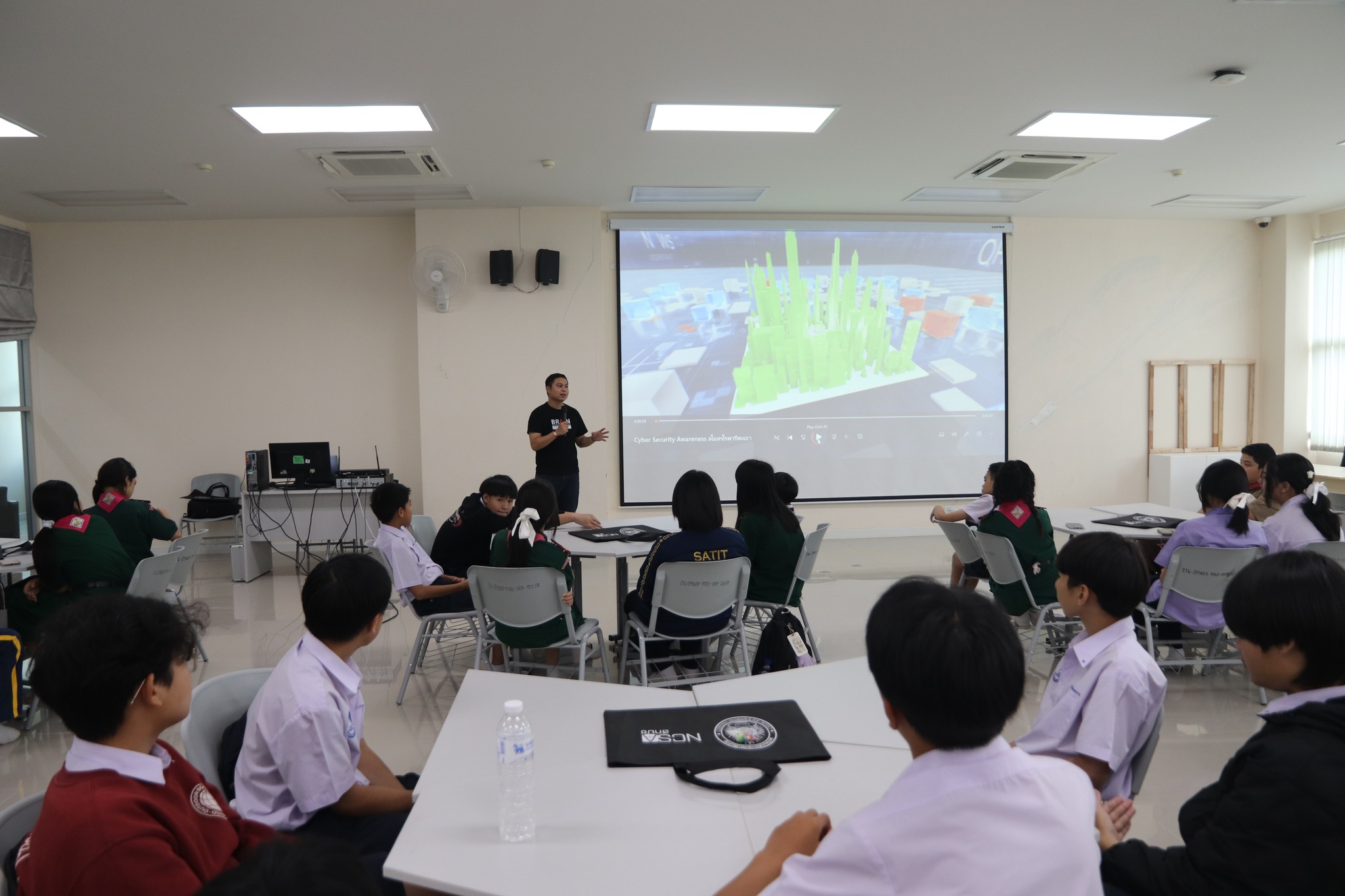 ภายในกิจกรรม นักเรียนได้รับความรู้พื้นฐานด้านความมั่นคงปลอดภัยไซเบอร์ การบรรยายเกี่ยวกับรูปแบบภัยคุกคามและแนวทางป้องกันเบื้องต้น พร้อมร่วมกิจกรรม Cyber Board Game ภายใต้การดูแลของ ผศ.ดร.มยูร ใยบัวเทศ จาก มหาวิทยาลัยราชภัฏเชียงราย และทีมงาน โดยแบ่งกลุ่มผู้เข้าร่วมเพื่อเรียนรู้ผ่านการเล่นเกมที่สอดแทรกเนื้อหาด้านความปลอดภัยไซเบอร์อย่างสร้างสรรค์ ช่วยให้นักเรียนเข้าใจและสามารถนำความรู้ไปประยุกต์ใช้ในชีวิตประจำวันได้อย่างเหมาะสม
